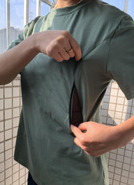 Answer 2: The tee is designed with discreet hidden zippers on each side, allowing for easy, one-handed access for nursing and comfortable pumping sessions wherever you are.